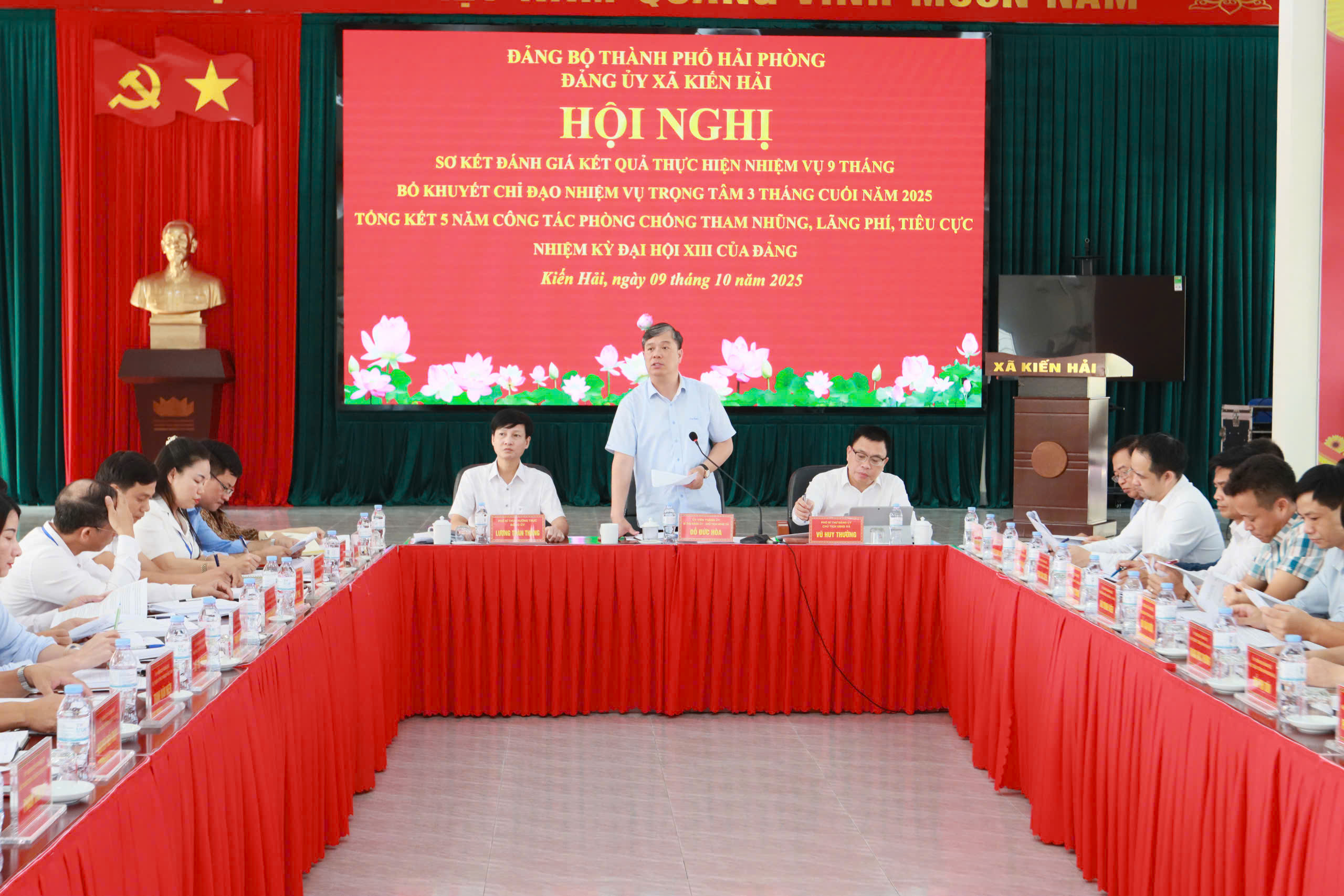 (Haiphong.gov.vn) - Sáng 9/10, Đảng ủy xã Kiến Hải tổ chức Hội nghị Ban Chấp hành Đảng bộ xã (mở rộng) nhằm sơ kết, đánh giá kết quả thực hiện nhiệm vụ công tác 9 tháng, bổ khuyết chỉ đạo nhiệm vụ trọng tâm 3 tháng cuối năm 2025 và tổng kết 5 năm công tác phòng, chống tham nhũng, lãng phí, tiêu cực nhiệm kỳ Đại hội XIII của Đảng.