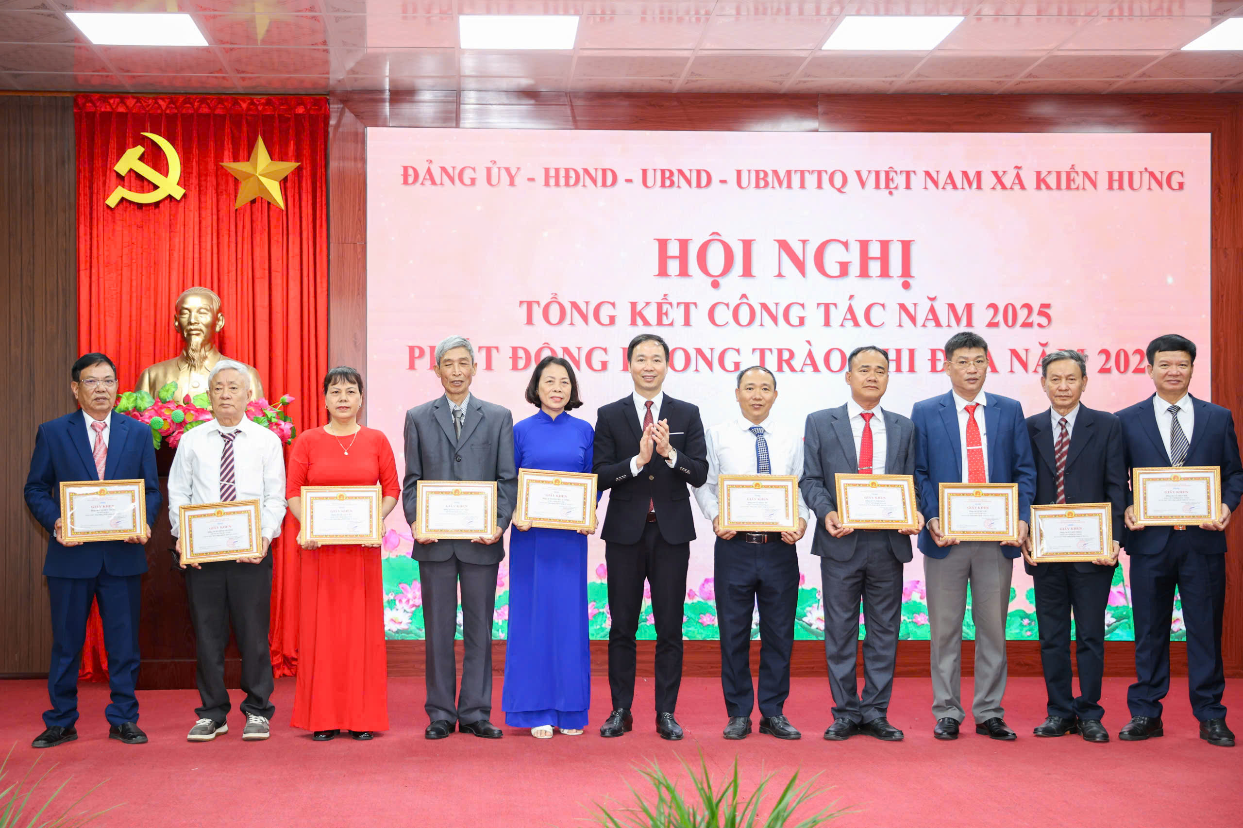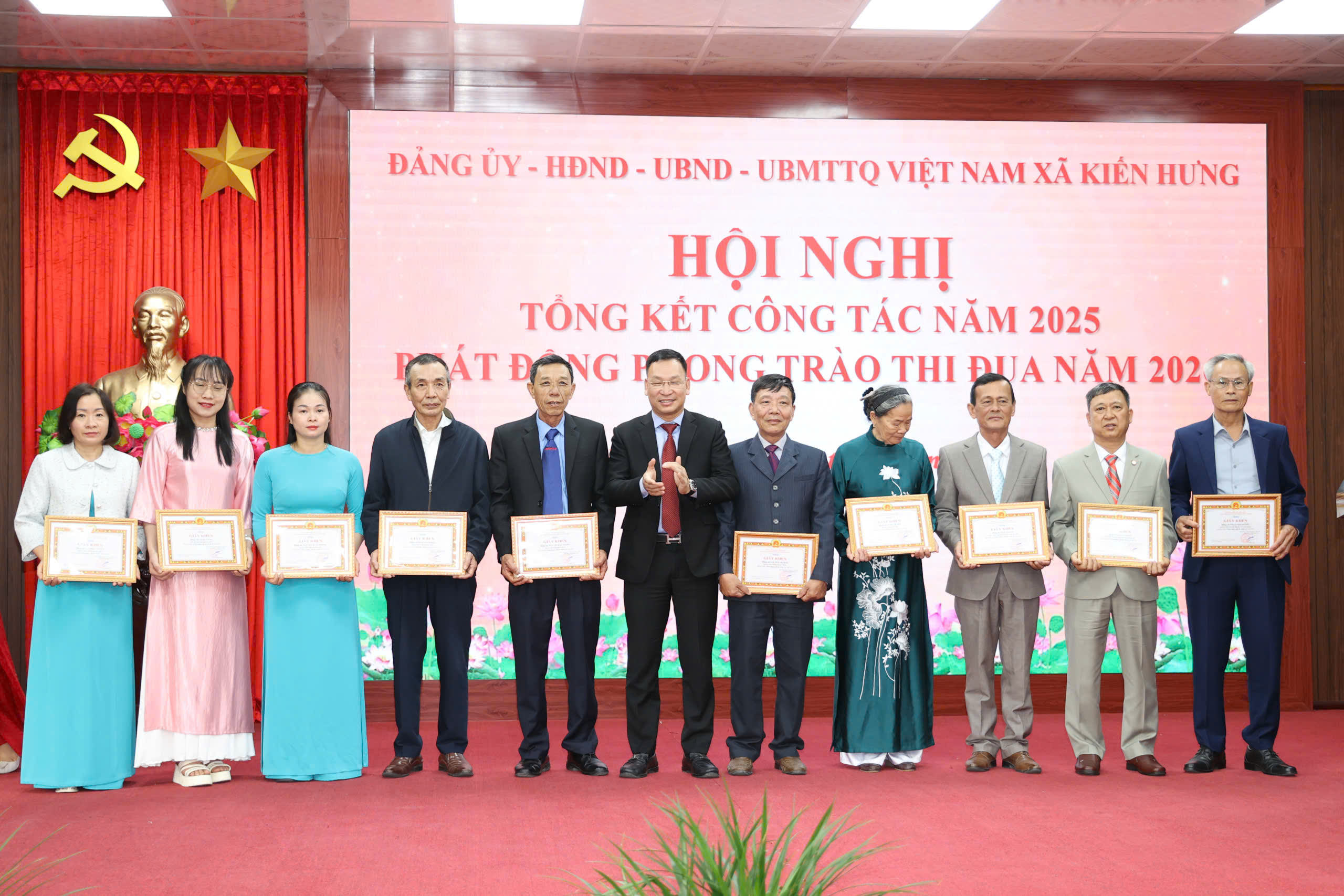 Tại Hội nghị, xã Kiến Hưng phát động phong trào thi đua năm 2026 với chủ đề “Tiếp tục đổi mới phương thức lãnh đạo của Đảng theo tinh thần ‘6 rõ’; thu hút đầu tư, mở rộng không gian kinh tế”, phấn đấu xây dựng Kiến Hưng phát triển nhanh, bền vững. Dịp này, nhiều tập thể, cá nhân có thành tích xuất sắc trong công tác xây dựng Đảng, phát triển kinh tế, xã hội và phong trào thi đua năm 2025 được xã biểu dương, khen thưởng.