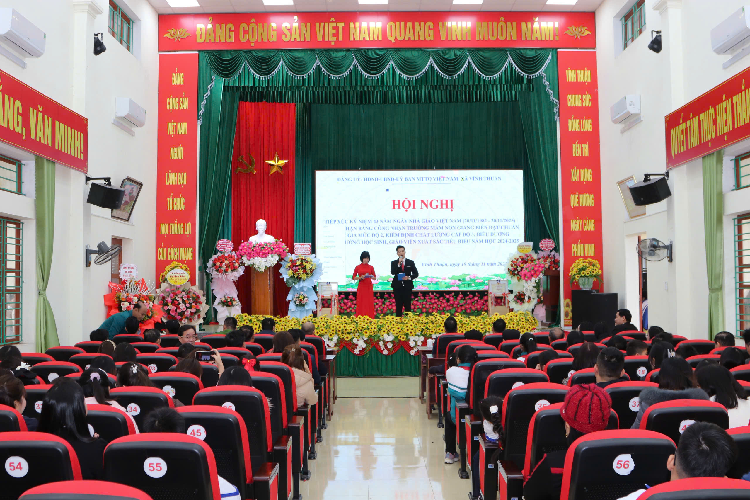 Quang cảnh Hội nghị.Phát biểu tại Lễ Kỷ niệm, Phó Chủ tịch Thường trực UBND xã Vĩnh Thuận – Đoàn Đức Giang đã ôn lại lịch sử ra đời Ngày Nhà giáo Việt Nam và nhìn lại chặng đường cống hiến của ngành giáo dục trong 43 năm qua. Trong bối cảnh yêu cầu đổi mới giáo dục ngày càng cao, đội ngũ giáo viên xã Vĩnh Thuận luôn nỗ lực đổi mới phương pháp giảng dạy, tăng cường ứng dụng công nghệ thông tin, triển khai chương trình giáo dục phổ thông mới, hướng tới xây dựng môi trường học tập hiện đại và bền vững. Lãnh đạo xã bày tỏ lòng tri ân đối với những đóng góp của đội ngũ giáo viên; đồng thời đề nghị các nhà trường tiếp tục đổi mới tư duy, nâng cao chất lượng chuyên môn, đẩy mạnh chuyển đổi số và xây dựng môi trường giáo dục nhân văn, sáng tạo.