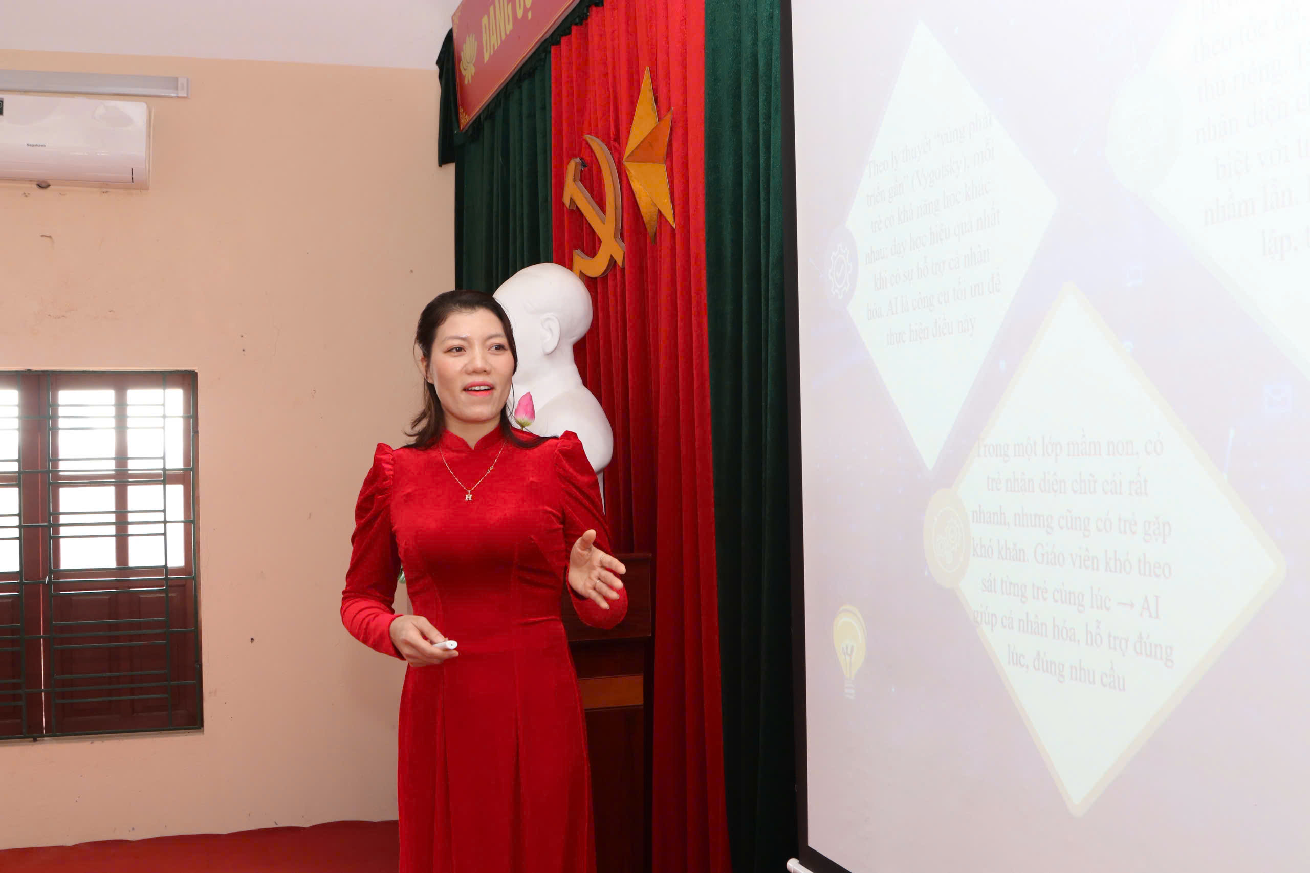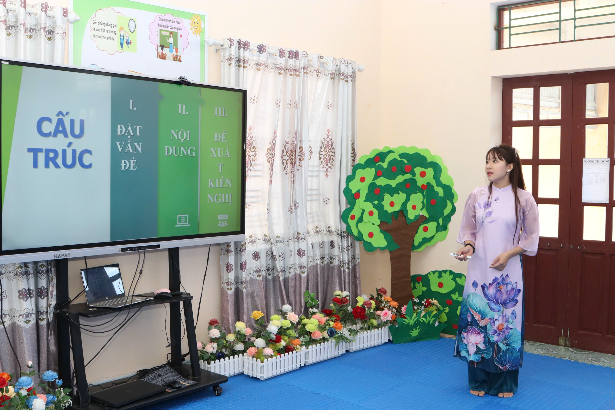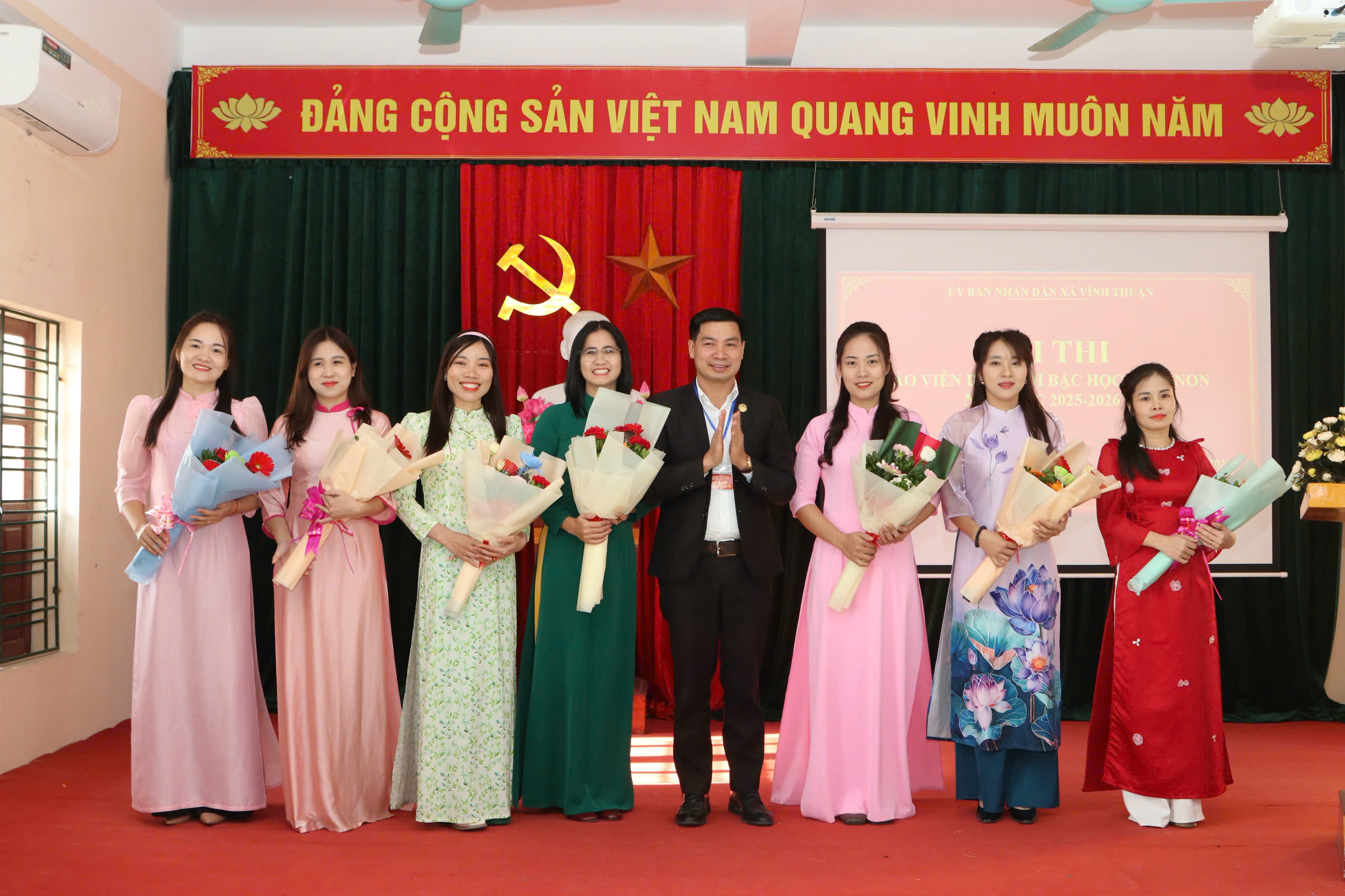 Đồng chí Đoàn Đức Giang, Phó Chủ tịch UBND xã tặng hoa cho các giáo viên tham gia Hội thiỞ phần thi lý thuyết, nhiều giáo viên đã chuẩn bị kỹ lưỡng, khoa học, sáng tạo, thể hiện hình ảnh trình chiếu, âm thanh sống động, ứng dụng công nghệ thông tin trong đổi mới phương pháp theo quan điểm lấy trẻ làm trung tâm.